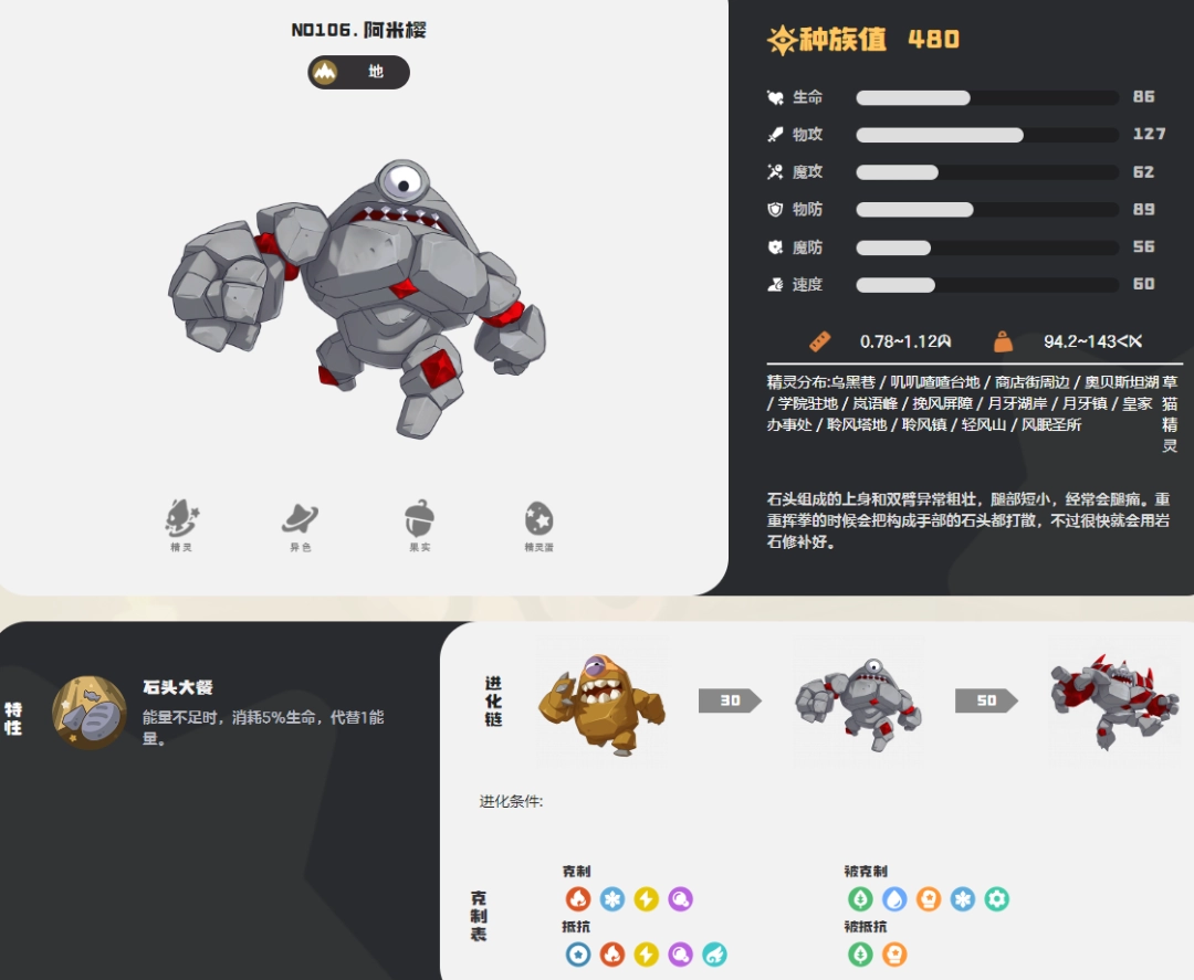 第一眼看到阿米樱的上半身,你一定会认为这是一位稳如磐石的力量型战将——由岩石构筑的身躯与臂膀,显得尤为粗壮强悍。然而,当视线转移到下半身时,整体气质便产生了戏剧性的变化:一双与魁梧上身形成鲜明对比的敦实短腿,构成了它极具辨识度的外形。也正是这种独特的身体结构,让它在日常行动中时常需要面对“腿部不适”的小困扰。
