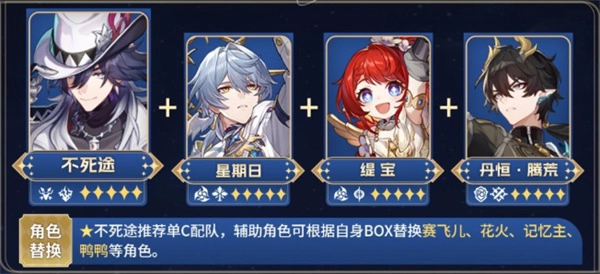 这套阵容堪称当前版本追击体系的终极形态。星期日为全队提供强大的增益效果与行动提前,缇宝的追加攻击协同机制能与不死途的技能产生完美联动,极大提升追击频率。丹恒·腾荒作为核心输出,在两者的加持下能够倾泻出毁灭性的伤害。整个队伍联动紧密,出手循环流畅,是追求极致输出与短轴爆发的顶级选择。