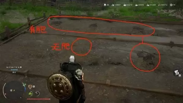 获得肥料后,在具体种植过程中需要格外注意观察。成功施加肥料并确保完成灌溉(即洒水操作)的农田,其外观会产生明显的视觉变化。土壤会呈现出一种湿润、肥沃的深色状态,与周围未处理土地形成鲜明对比,具体效果可以参考下方图示。