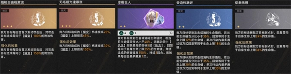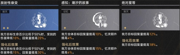 除了核心的“烧血-回血”循环外,获取耀变充能还有多种高效补强手段。所有能提升治疗量的祝福都应优先获取并升级,这能显著放大每次回复产出的充能收益。开局阶段,一星方程「换心魔」能在瑕蝶行动的最初两回合内,直接灌注大量初始充能,帮助队伍快速建立优势;而二星方程「灾异偶像」则提供全局的耀变获取效率加成,是稳中求进的选择。毁灭系的二星祝福「遮蔽性隐带」也能提供基础且直接的耀变值补充,作为前期过渡非常实用。