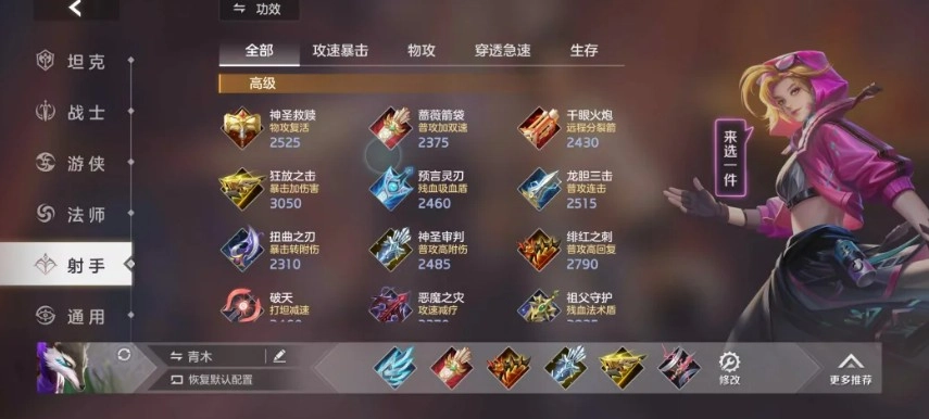 最后,我们来探讨青木的出装思路。开局首选“刀锋之翼”,提供前期不可或缺的攻击速度与普攻伤害加成,保证对线压制力;第二件“蔷薇箭袋”几乎是必出装备,其提供的攻击速度与冷却缩减完美契合青木的需求;第三件“神圣审判”能进一步强化普攻特效伤害并提升攻速,是中期爆发的保障。