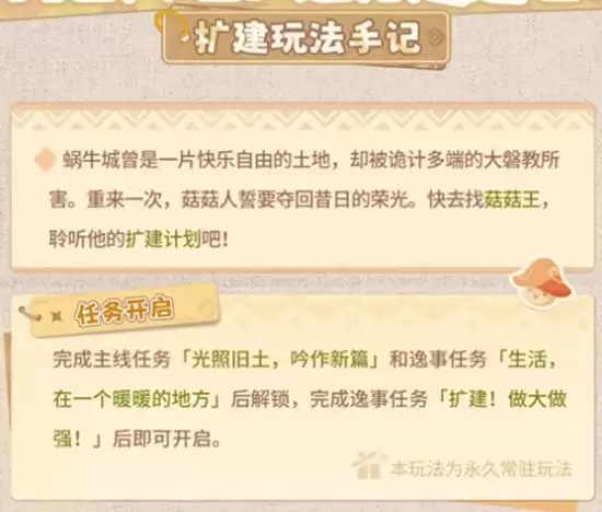 开启蜗牛城重建之旅需要满足几个前置条件。首先,需要推进主线任务至“光照旧土,吟作新篇”章节,并完成逸事任务“生活,在一个暖暖的地方”。随后,接取并完成引导任务“扩建!做大做强!”,即可正式解锁系统。前往蜗牛城寻找NPC菇菇王对话,便能全面了解扩建蓝图,开启你的城市经营之路。