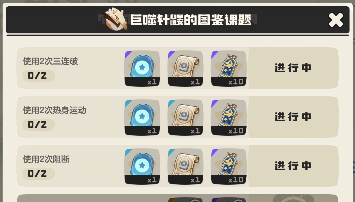 你的首要任务是培育一只巨噬针鼹。培养的核心目标是将其等级提升至48级。当巨噬针鼹达到48级后,便会自动领悟“热身运动”、“三连破”以及“阻挡”这三个必备技能。学习成功后,务必在它的战斗技能配置栏中装备上这三个技能,这是完成后续课题的前提条件。