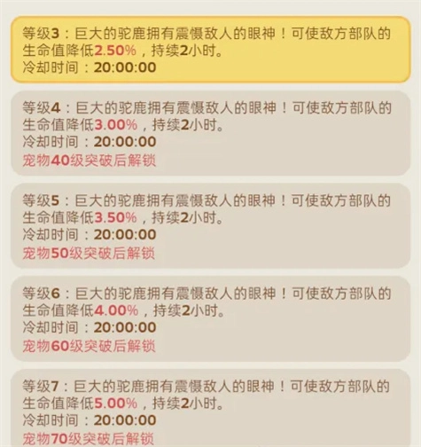 驼鹿定位于战斗辅助角色,可降低敌方部队最高5%的生命值,效果持续2小时。在联盟集结战、攻城战等大型对战前使用,能有效削弱敌方整体战力。