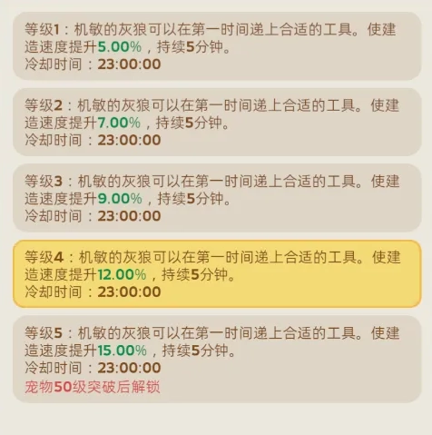 灰狼是典型的发展辅助型宠物,其技能可提供最高15%的建造速度加成,效果持续5分钟。在升级城堡、兵营等关键建筑时开启,能节省大量加速道具与发展时间。