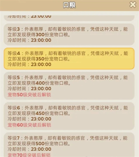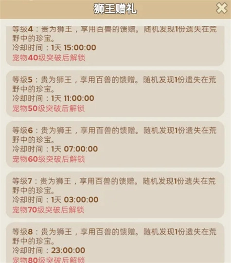 随着二代、三代宠物逐步解锁,资源分配需要更加集中和精准。对于大多数普通玩家而言,推荐的宠物升级优先级顺序为:狮子 > 灰狼 > 猎豹 > 野牛 > 猞猁 > 棕熊 > 驼鹿。狮子的每日珍宝奖励实用价值极高,有条件应优先培养至高级。前期将核心宠物升至40级左右即可满足需求,因为50级解锁的5级技能和所需的晋升奖牌,在游戏前期获取难度较高,无需强求。