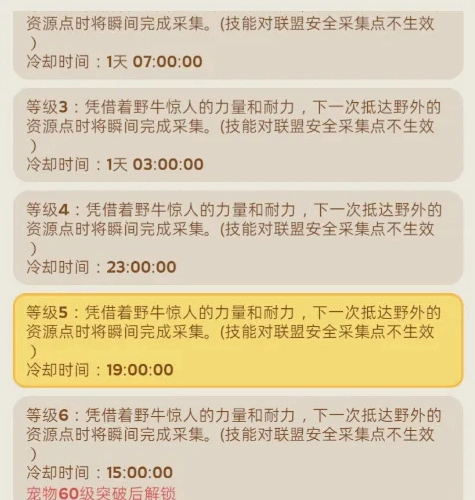 在灰狼培养成型后,可以开始着手培养猞猁和野牛。猞猁能够提供稳定的每日体力恢复,是持续作战的保障;而野牛的“立即完成采集”技能,在资源紧缺或争夺高级矿点的关键时刻,往往能起到决定性的作用。