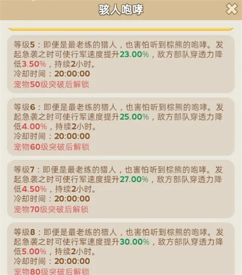 当然,对于愿意进行更多投入的中氪玩家,宠物培养的优先级可以调整优化为:狮子 > 灰狼 > 驼鹿 > 棕熊 > 猎豹 > 野牛 > 猞猁。至于资源非常充沛的顶级玩家,终极目标自然是将所有宠物都培养至满级的巅峰状态。