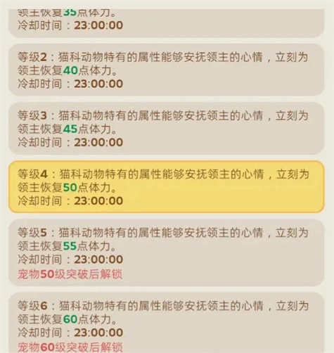 猞猁的功能直接而实用:每天为领主恢复一定体力,最多可达60点,是保障你每日能够持续进行采集、征伐等活动的关键。