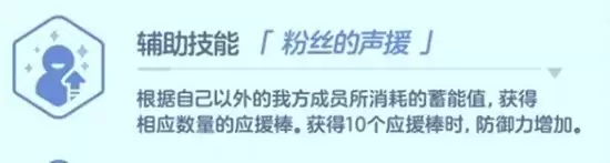 辅助技能“粉丝的声援”则完美体现了她的团队协作特性。当除美祢外的队友释放消耗Cost的技能时,美祢会获得等量的应援棒作为“声援”。当应援棒累积达到10个时,美祢自身的防御力将获得额外提升。这一机制鼓励玩家将她与那些技能释放频繁、Cost消耗较快的队友进行搭配,从而形成“队友行动→美祢强化→团队更稳”的良性循环,显著提升队伍的整体续航与硬度。
