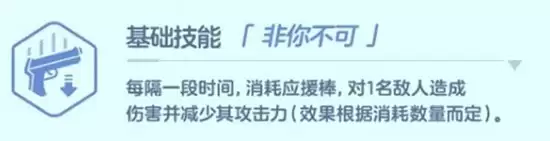 其基础技能“非你不可”会周期性自动发动。发动时需要消耗一定数量的应援棒,对单一目标造成伤害的同时,施加攻击力下降的减益效果。关键点在于:所消耗的应援棒数量越多,降低敌人攻击力的幅度就越大。这要求玩家在实战中需要有策略地囤积应援棒,以便在关键时刻对敌方高威胁单位进行致命削弱。