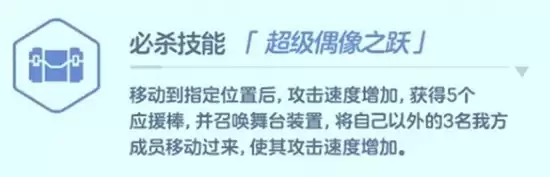 战术核心在于她的必杀技“超级偶像之跃”。该技能分为两个阶段:第一阶段,美祢跳跃至指定区域,提升自身攻速并获得5个应援棒;第二阶段,她召唤舞台装置,将距离最近的三名队友“牵引”至自己身边,并大幅提升他们的攻击速度。此技能拥有巨大的战略价值,集快速集结、阵型调整与群体爆发增益于一体,无论是用于集火秒杀关键目标,还是发起一波流攻势都极为有效。使用时需格外注意落点选择,避免将队友引入危险区域。