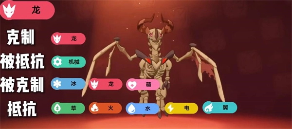 龙系: 仅克制龙系自身,且攻击会被机械系抵抗。需防范冰、龙、萌系的克制伤害。其强大的防御抗性涵盖草、火、水、电、翼五种属性。