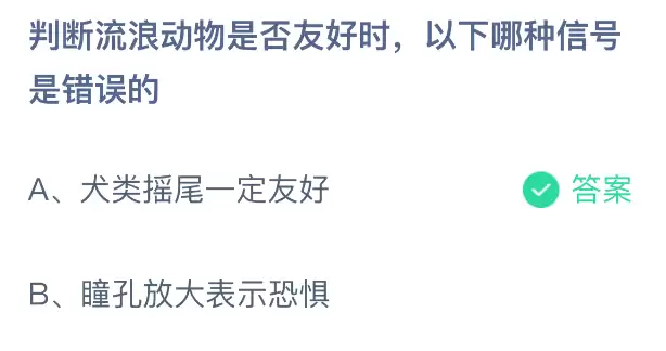 今日蚂蚁庄园小课堂的首道题目是:在判断流浪动物是否友善时,以下哪一种信号解读是不正确的?