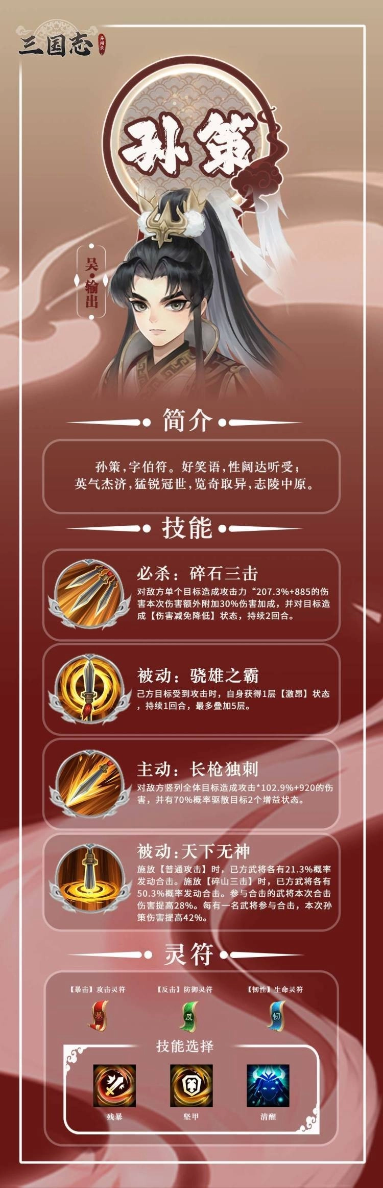 《三国志异闻录》凭借Q萌画风与深度策略回合制玩法,收获了大量玩家喜爱。游戏中武将定位多样,阵容搭配与养成路径变化无穷。在众多强力武将中,吴国的孙策以其卓越的单体爆发和强大的合击能力,始终占据输出核心梯队。为了让各位玩家能迅速掌握这位“江东小霸王”的培养精髓,本文将提供一份全面的孙策培养指南,助你打造战场上的绝对主力。