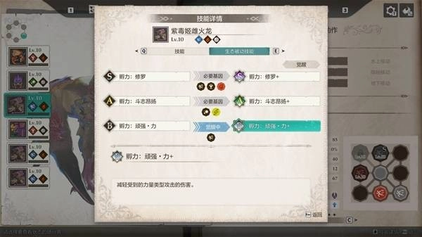 补充说明,在阵容构思初期,也曾考虑以5只“棘龙”为核心组建速通队伍,以期触发“边境的王者之师”这一强力队伍效果。但经过深度对比分析,最终选择了紫毒姬。关键点在于:两者虽都拥有强力的全体火属性必杀技,且在基础威力、破龙能力数值上完全一致,但棘龙的必杀技缺乏紫毒姬所具备的攻击强化增益。因此,从实战输出效率角度考量,紫毒姬无疑是更佳的选择。