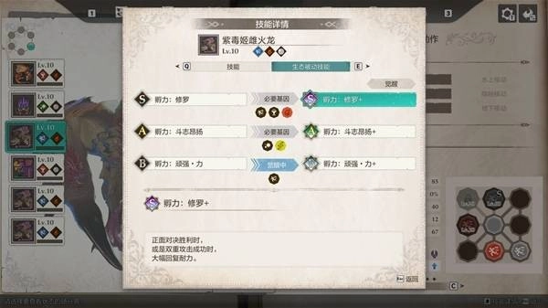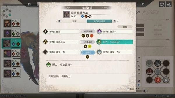 王之审判(火属性-力量类型)+ 绯红诀窍(火属性-提升全体会心)+ 烈焰风暴(火属性-速度类型) ——激活“火属性”基因连线。