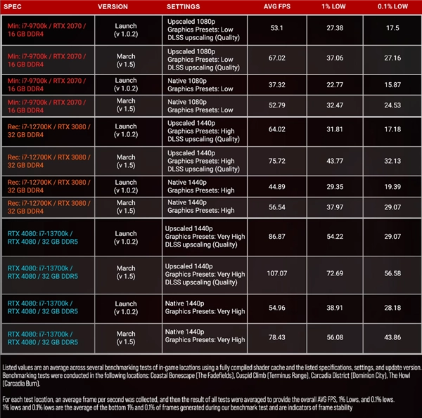 开启NVIDIA DLSS质量模式后,游戏性能同样获得大幅增强。最低配置环境下,帧率从53.1 FPS提升至67.02 FPS;推荐配置下,帧率从64.02 FPS增加到75.72 FPS;而使用RTX 4080显卡时,平均帧率由86.87 FPS突破至107.07 FPS。由此可知,无论是否借助AI超采样技术,本次更新均能确保更稳定、更流畅的高帧率游玩过程,有效提升游戏运行的速度与稳定性。