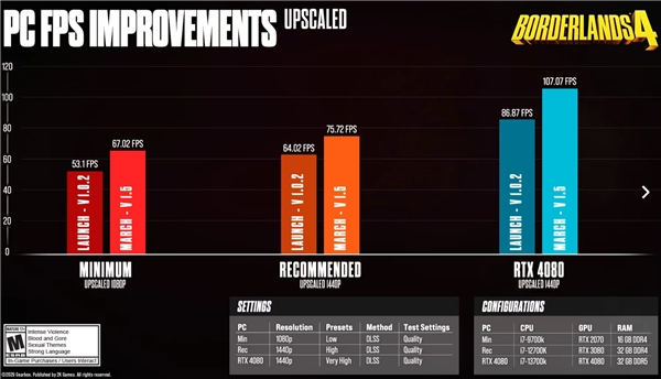 本次《无主之地4》性能补丁针对不同硬件配置的玩家均带来了明显优化。在1080p低画质设定下,符合最低配置的PC平均帧率由37.32 FPS提升至52.79 FPS,改善幅度约41.5%,让入门玩家同样能获得流畅的入门体验。对于推荐配置的PC,在1440p高画质下游玩时,平均帧率从44.89 FPS上涨到56.54 FPS,涨幅约26%。而对于硬件发烧友,采用RTX 4080显卡配合1440p极高画质时,性能提升最为惊人:平均帧率从54.96 FPS一举跃升至78.43 FPS,提升幅度高达42.7%,为追求极致画质及超高帧数的玩家带来质的提高。