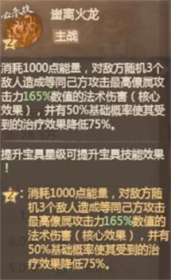 总而言之,蚩离火龙尊是一件特色鲜明、战术针对性极强的橙色助战宝具。它能为您的阵容库增加一种强有力的反制手段,在合适的对局中具备一锤定音的能力。建议玩家在布阵时,根据敌方阵容特点灵活选用,扬长避短,使其成为您征战之路上的可靠助力。