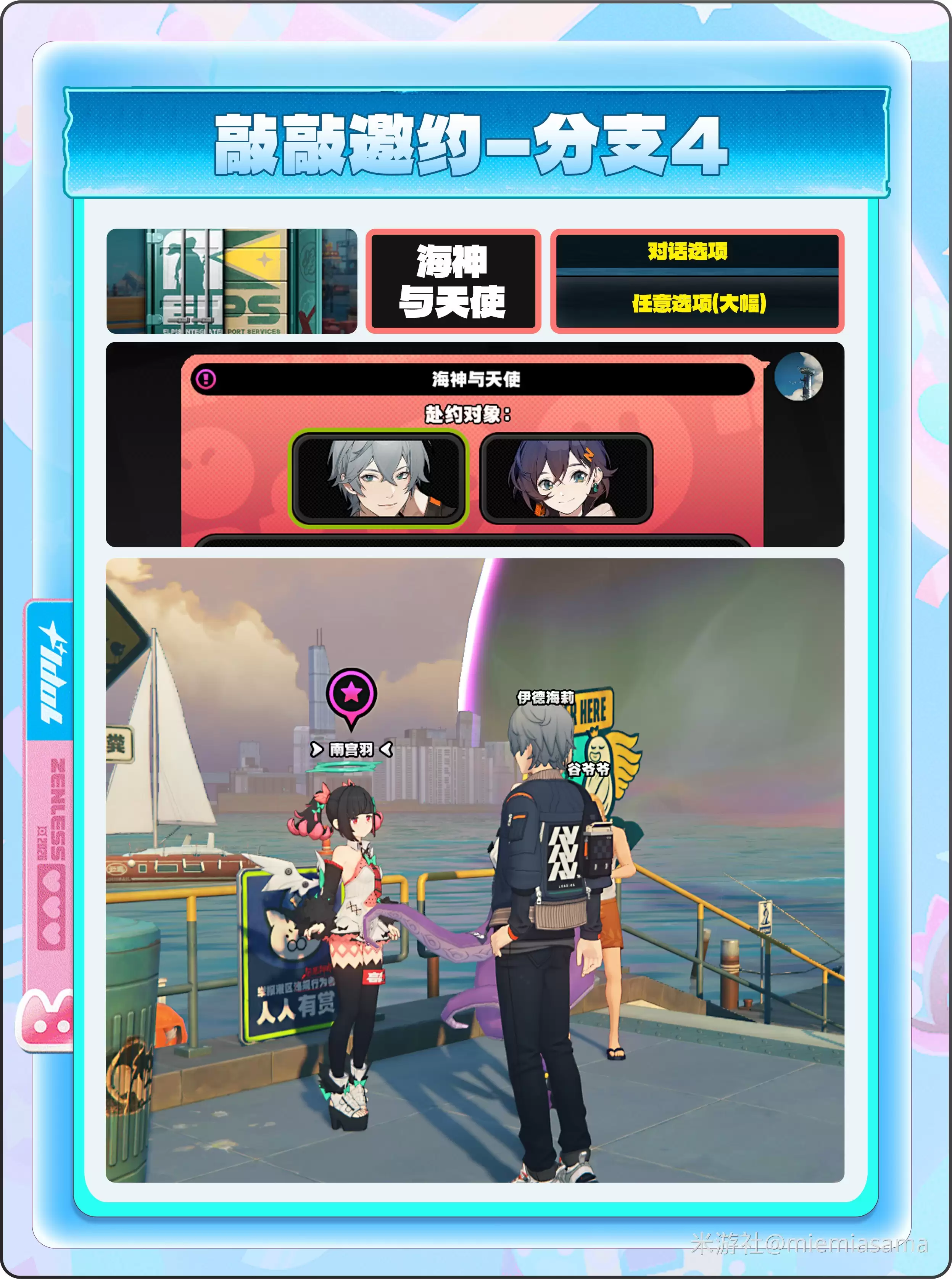 绝区零南宫羽邀约选项一览,本文介绍的是新代理人【南宫羽】信赖度快速提升方案。【敲敲邀约】大幅提升方案,以下仅为个人建议的选项路线,可供玩家参考。《绝区零》南宫羽邀约选项介绍:敲敲邀