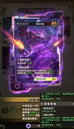 更关键的是功能性的全面升级:燃油弹索敌范围额外增加40%,局内触发强化效果的概率变为100%。这意味着在实战中,玩家可以稳定获得超广的攻击范围与极高的伤害倍率加成。毋庸置疑,满星「硫化火焰」是火系流派后期成型不可或缺的战略级核心卡牌。