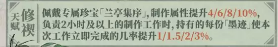 第二个天赋「修禊」需要与其专属珍宝「兰亭集序」搭配才能展现完整强度。佩戴珍宝后,王羲之的制作属性将获得4%至10%的永久提升。更为关键的是,当执行2小时以上制作工作时,每持有一份「墨迹」,本次任务立即完成的概率将提升1%至3%。