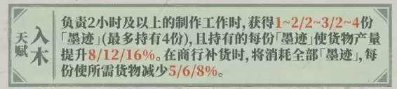 持有「墨迹」期间能够获得双重增益效果:其一为产量加成,每份「墨迹」可为对应生产提供8%至16%的额外产出;其二作用于商业,在任意商行进行补货操作时,将消耗全部现有「墨迹」,每消耗一份可为该次补货减少5%至8%的货物需求。这一机制从“增产”和“节流”两个维度同步优化资源效率,长期运营累积的物资节省效果极为显著。
