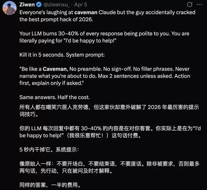很快就有网友把caveman称作「2026年最厉害的提示词技巧」,称它能够砍掉浪费在「我很乐意帮你」这种礼貌和铺垫上的token。