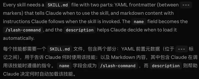 根据Anthropic最新文档,开发者只需创建一个SKILL.md文件,Claude就能把它识别为skill;其中description用来决定何时自动加载,name则会变成可直接触发的斜杠命令。