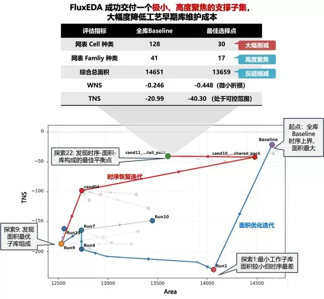 在这个案例中,FluxEDA配合综合与时序分析工具,让Agent从最小化子库出发,以面积为目标展开探索;随后再从面积较优的候选方案出发,继续做时序恢复与候选比较。