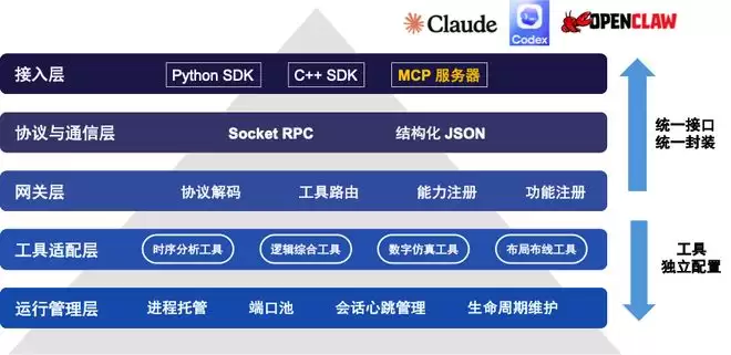 FluxEDA并不是简单「包一层 API」。它打通了从TCL gateway、Socket RPC 协议、Python/C++ SDK、CLI 到MCP Server的完整链路,将散落在不同 shell 中的工具能力整理成结构化、可注册、可调用的原子 API,让上层 Agent可以通过统一的api_*接口持续驱动真实工具流程。
