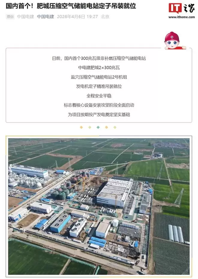 IT之家 4 月 6 日消息,据中国电建今日分享,国内首个 300 兆瓦级非补燃压缩空气储能电站 —— 中电建肥城 2×300 兆瓦盐穴压缩空气储能电站 2 号机组发电机定子精准吊装就位,全程安全平稳,标志着核心设备安装攻坚阶段全面启动。