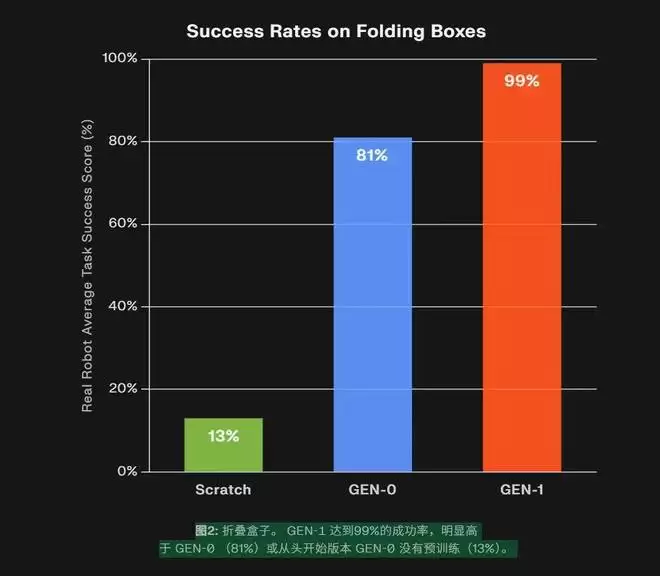 相较上一代 Gen-0 平均 64% 的成功率,GEN-1 在多项任务中已经做到 99%,包括 T 恤折叠、吸尘器维护等操作,能够连续运行数百次而无需人工干预。