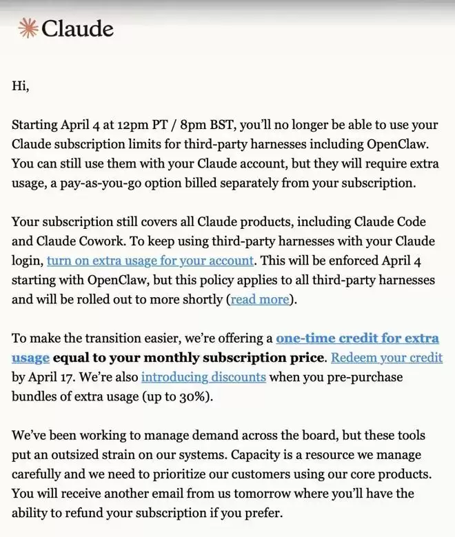 Claude最新发送的邮件还提到,这项政策从4月4日起先在OpenClaw上强制执行,但适用于所有第三方工具链,并将很快推广至更多工具。