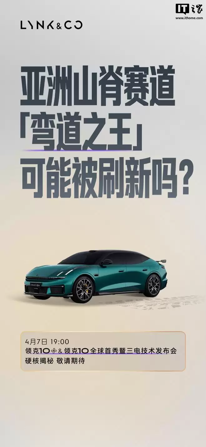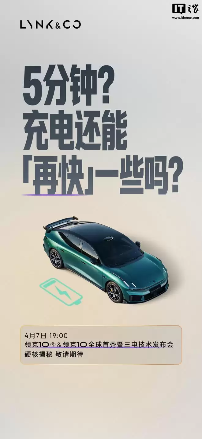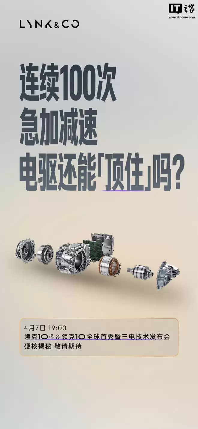 IT之家 4 月 6 日消息,领克汽车最新今日宣布,领克 10+ & 领克 10 全球首秀暨三电技术发布会定档 4 月 7 日 19:00 举行,将解答电芯和电池能否硬扛「超纲」打击、连续 100 次急加减速电驱能否「顶住」、充电能否再快一些等问题。