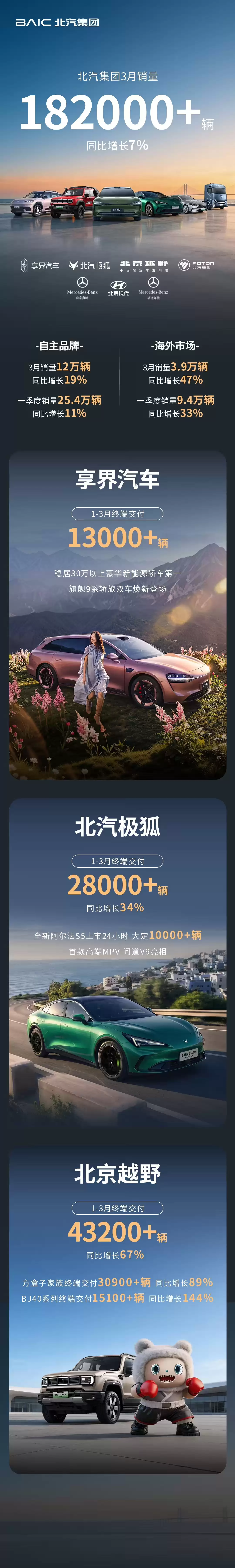 其中,享界汽车今年 1-3 月终端交付超 1.3 万辆,北汽极狐同期交付超 2.8 万辆同比增长 34%,北京越野同期交付超 4.32 万辆同比增长 67%。