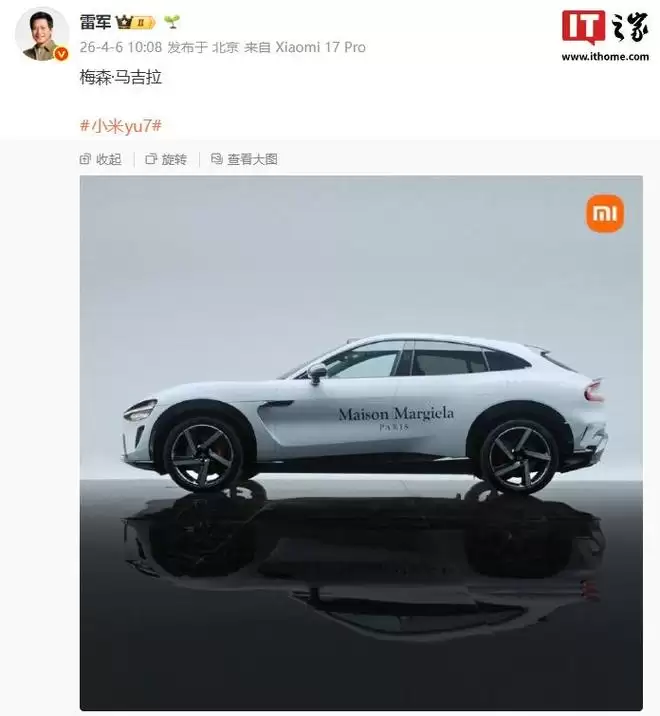 雷军晒小米YU7梅森·马吉拉涂装版
