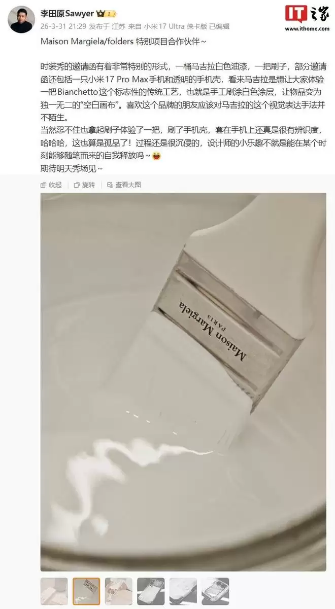 小米汽车工业设计总经理、首席设计师李田原在今年3月底曾透露过小米和 Maison Margiela / folders 的特别项目合作,并晒出了小米17 Pro Max 的定制设计壳。