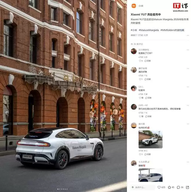 IT之家4月6日消息,小米创办人、董事长兼 CEO 雷军今日晒出了小米 YU7梅森 · 马吉拉涂装版的外观。画面显示,该车采用专属极简白涂装 + 品牌标识设计。
