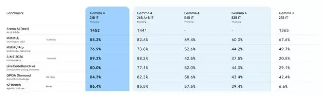 ▲Gemma 4系列模型在多项基准测试中的表现对比(图源:blog.google)