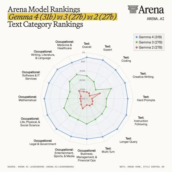 ▲Gemma系列模型在Arena文本类别排名对比(图源:Arena.ai)