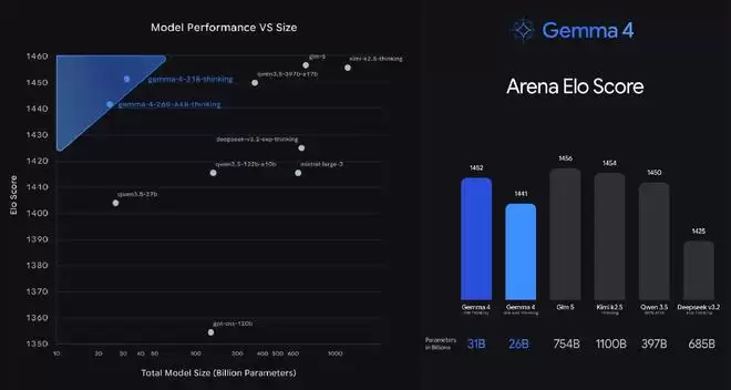 ▲Gemma 4 在Arena用户偏好排行榜中的参数量对比(左)与用户偏好(右)(图源:blog.google)