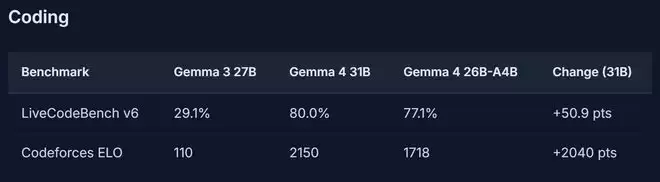 尤其在编程能力上,Gemma 4的Codeforces ELO评分相较上一代Gemma 3的110分(接近勉强可用水平),大幅提升至2150分(接近竞技编程专家级)。