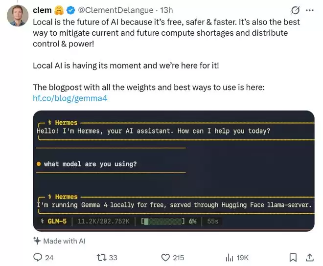 Hugging Face联合创始人克莱门特·德朗格(Clément Delangue)将Gemma 4模型发布视为“本地AI正在迎来关键发展阶段”,并认为开放模型与可本地部署能力将成为未来AI的重要方向。