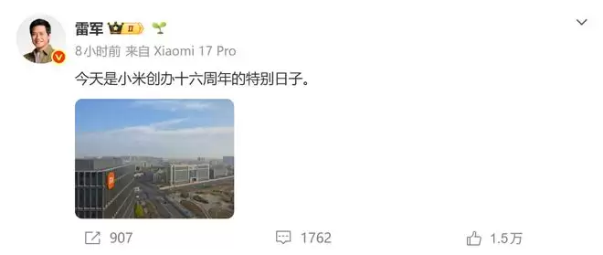 小雷哔哔(ID:xiaoleibbb)注意到今天还是小米创办 16 周年,雷军一大早就发了微博说今天是个特别的日子。