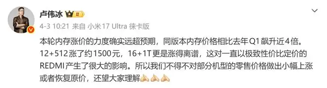 其实涨价这事吧,小米总裁卢伟冰早在几个月前就打过“预防针”了。相信大家伙都知道,伴随全球存储芯片价格飙升,内存、闪存这些成本涨得那叫一个离谱。不出意外的话,手机行业整体都会跟着水涨船高。所以卢伟冰当时说话也挺实在:扛不住也会涨。