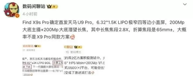 其他产品细节方面,OPPO Find X9s Pro确定首发天马U9 Pro,6.32"1.5K LIPO极窄四等边小直屏,200Mp大底主摄+200Mp大底潜望长焦,其中长焦焦段2.8X,折算焦段是65mm±,大概率不是X9 Pro同款方案。
