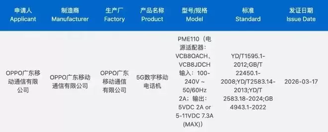 除此之外,一款型号为PME110的OPPO旗下新机在最近通过了认证。
