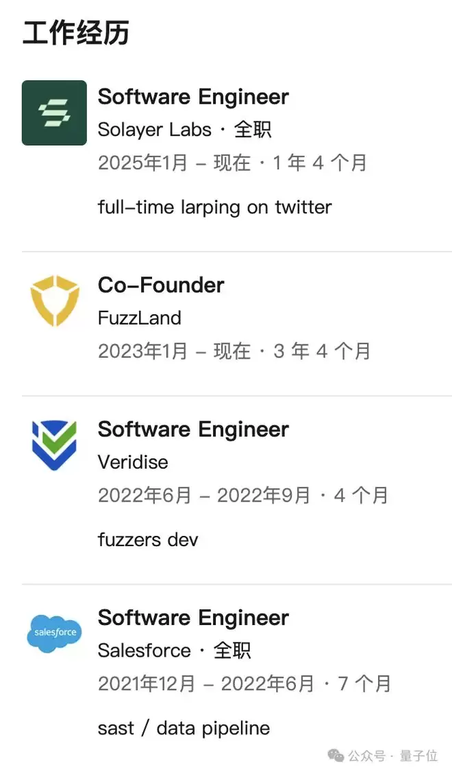 再往前追溯,Chaofan还曾在Salesforce担任安全工程师,主要参与静态应用安全测试(SAST)、内部网络扫描服务以及数据管道的建设。